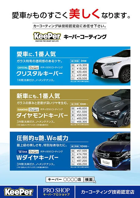 ノーメンテナンスで1年耐久の(クリスタルキーパー)やノーメンテナンスで3年もしくは年に1回のメンテナンスで5年耐久の(ダイヤモンドキーパー)等、お客様のカーライフに合わせお選び頂けます。