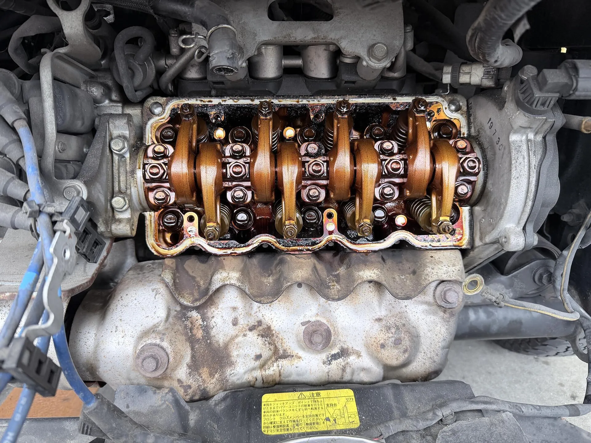 エンジンを開けてみると、画像のように内部にはオイルが滲んでおり、ガスケット部分からしっかり漏れている状態でした。